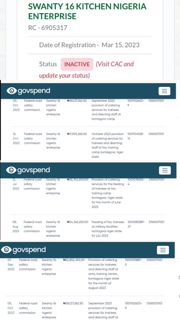 According to records from the Corporate Affairs Commission (CAC), Swanty 16 Kitchen Enterprise was registered on March 15, 2023, yet went on to receive multiple contract awards from the FRSC shortly after its establishment.
